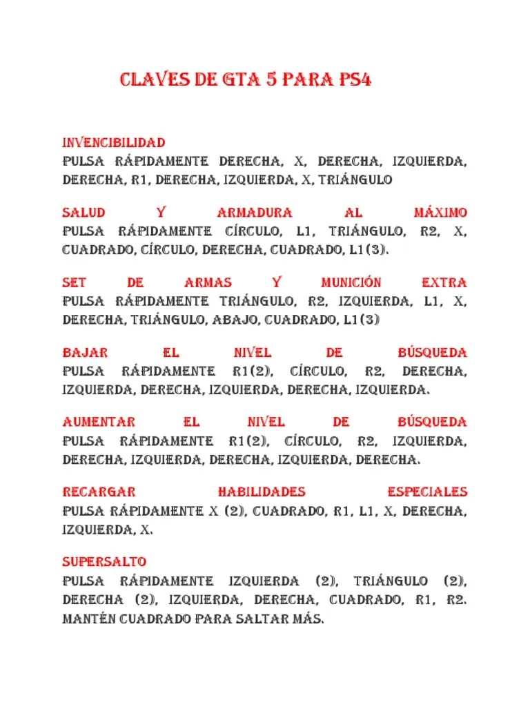 CODIGOS PS3 Y XBOX***** Xbox: Y, RT, ←, LB, A, →, Y, abajo, X, LB, LB, LB PS3: Triangulo, R2, ←, L1, X, →, Triangulo, abajo, cuadrado, L1, L1, L1 - GTA 5 ...